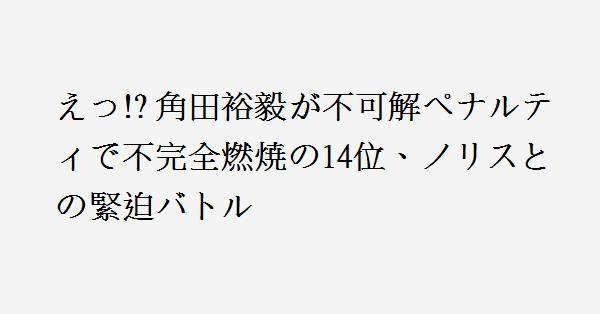 1、あれでペナルティを取られたのはしょうがないと思う。2、3回走路を変えていたからね。スピードが明らかに違う中でなんとかコース上でブロックしようとしたが、コース外にはみだしてオーバーテイクしたノリスが見事。仮に1周ノリスを抑えることに成功してルクレールがノリスの前に出たとしても、チャンピオンの可能性が無くなったピアストリが最後に順位を譲るだろうからいずれにしてもノーチャンスだった。角田は最後まで自分のために走るレースが出来なかったのは残念だったな。ノリス、チャンピオンおめでとう。そして、角田、一旦お疲れ様でした。またここに戻ってきて自由に走る角田が見たい。