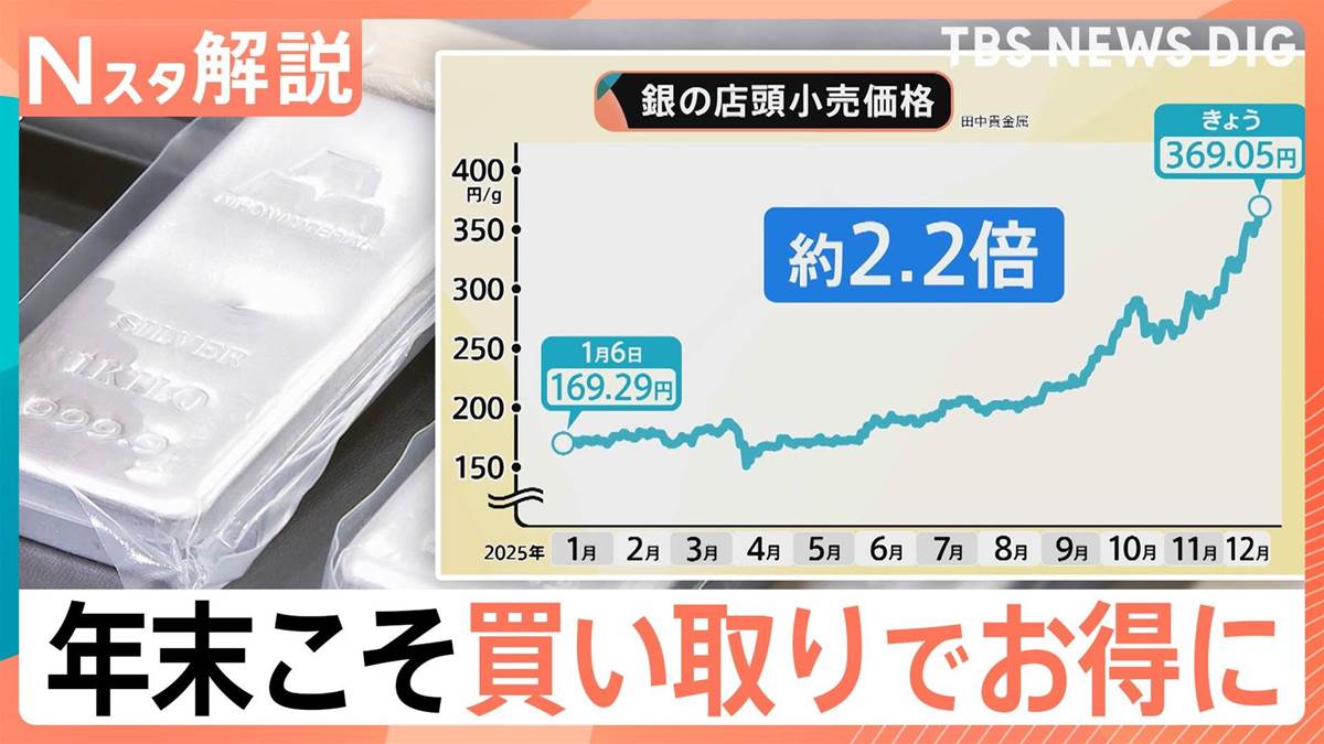 東京・銀座の買取専門店に60代男性が金貨を持ち込み、昭和天皇の60周年在位記念に発行された10万円金貨が査定された。結果、40年前に発行された金貨は42万5000円という驚きの価格になった。金の価格はここ1年で約1.6倍となり、さらに銀の価格は2.2倍に上昇。買取店には大掃除で出てきたシルバー食器などの持ち込みが増加している。