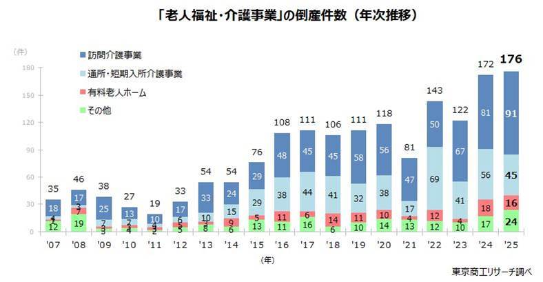 2025年の介護事業者の倒産件数は過去最多の176件で、前年比2.3%の増加を記録しました。特に訪問介護が91件と最多を更新、原因には人手不足やガソリン代の高騰が挙げられます。一方でデイサービスや有料老人ホームの倒産件数はわずかに減少しましたが、依然として高水準です。多くの倒産は小規模事業者に集中し、資本金500万円未満や従業員10人未満の企業が多いです。売上不振が主な倒産原因で、業界全体が厳しい状況にあります。