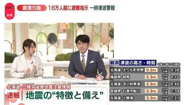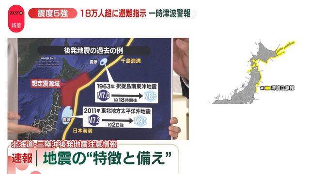 青森県で震度5強を観測した地震を受け、気象庁が「北海道・三陸沖後発地震注意情報」を発表しました。同情報はマグニチュード7以上の地震が発生した際に出されるもので、今回、海溝近くでのプレート衝突による大規模地震が基準を満たしたことから発表されました。この地域では過去にも大地震が相次いで発生しており、今後1週間程度、最大震度5強の地震や津波の警戒が必要とされています。平常時の巨大地震発生確率0.1%が1%に上昇しており、普段と比べ10倍のリスクとなることが示されています。現在避難指示はありませんが、準備として家具固定、非常用バッグと防寒具の確認、避難場所や連絡手段の検討が推奨されています。