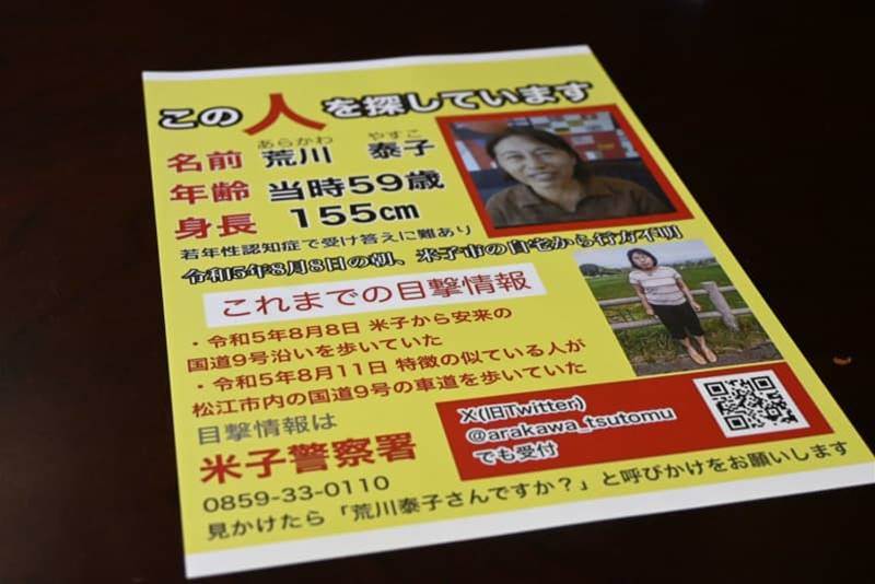 2023年8月8日、鳥取県米子市で荒川勉さんの妻、認知症患者の泰子さん(当時59歳)が失踪した。勉さんは当初、最寄りのスーパーにいると考えたが、実際には居なかったため警察に連絡した。警察の防犯カメラ映像は泰子さんが島根県方面に向かう姿を捉えていたが、行方は不明のまま。若年性認知症患者の泰子さんについて、鳥取県のガイドラインが即時の県外通知を行わなかったことが捜索を遅らせた。