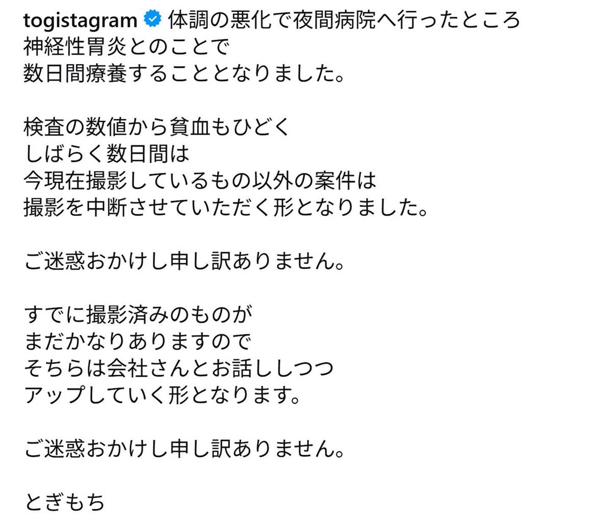 大食いユーチューバーのとぎもち氏が神経性胃炎で数日間の療養を告知しました。29日にインスタグラムで公開された知らせで、体調悪化により夜間病院を訪れ、診断を受けたとのことです。また、貧血がひどい状態で、現在撮影中の案件以外は中断することを発表しました。社会では今月中旬以降、とぎもちが一度食べた物を吐き出す動画が拡散され、物議を醸しています。