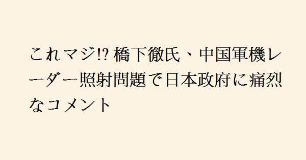 3、橋本をつかっていたり、記事を載せている新聞社もみんな戦争屋だって思ってます。煽って戦争したいだけ。だって橋本がTVでいった「レーダー照射やられたらやりかえせばいい」といったことをどこのオールドメディアも批判しないどころか使い続けている。この記事も普通ならやり返せといったことを記事にしなければいけない。オールドメディアがいかに世界の敵であり日本の敵かわかる典型例だと思う。