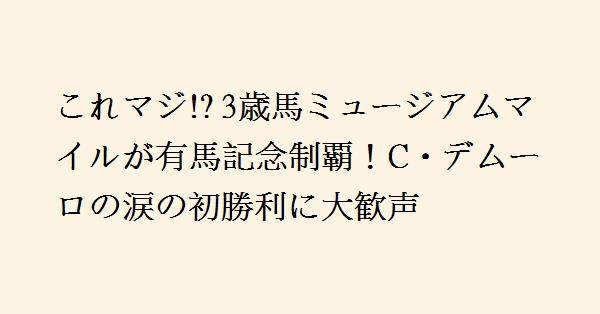 ミュージアムマイルを騎乗したC・デムーロは直線でコスモキュランダを差し切り、7度目の挑戦で初めての有馬記念を制覇し、ファンに大歓声で祝福されました。