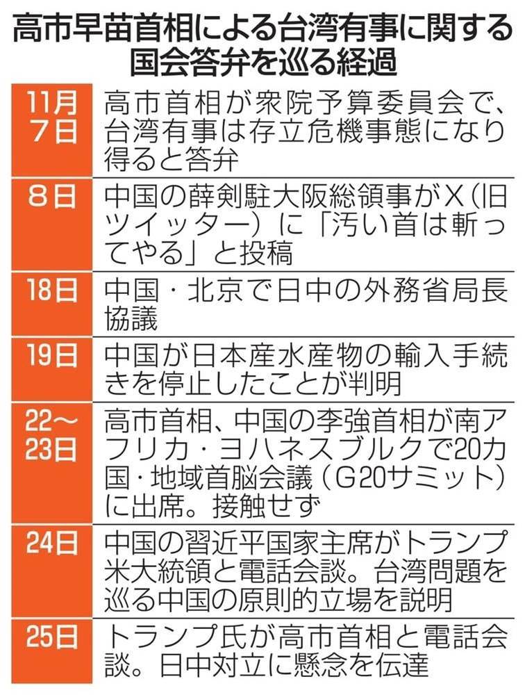 事件概要:2023年11月7日、高市早苗首相が国会において台湾有事に関連する答弁を行い、中国側がこれを強く反発。答弁では、シーレーン封鎖や武力行使等が存立危機事態となりうる可能性を言及。これを受け、中国の薛剣駐大阪総領事が攻撃的な発言を公開し、両国間の緊張が高まった。背景には中国の「強国路線」や習近平主席の対台湾政策があるとされ、日本側の立場発信や国際社会での連携が必要とされる状況へと進展している。