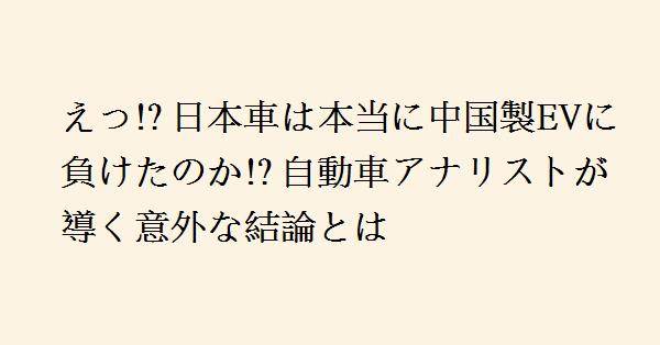 2、アジア諸国で確かに中国車が売れてはいる。ただその後に撤退している事が多く売りっぱなしの状況も多いと聞く。値段だけに目が眩みメンテナンスやアフターが出来なくなりゴミになるのが目に見えている。中国は国策として他国に自国の車を売り込むので日本メーカーが太刀打ち出来ないこともあるが、長い目で見れば日本メーカーの素晴らしさに気づき戻ってくるだろう。