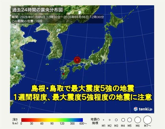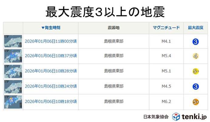 今日1月6日午前10時18分頃、島根県東部を震源とする最大震度5強の地震が発生しました。マグニチュード6.2と推定されるこの地震は横ずれ断層型で、西北西–東南東方向に圧力軸を持つものとみられています。島根県松江市・安来市、鳥取県境港市など計5つの市町村で震度5強を記録し、その後も余震が相次いでいます。揺れの地域では落石や崖崩れの危険性が高まっており、積雪が多い山地では雪崩にも注意が必要です。気象庁は特に地震発生後1週間程度、最大震度5強程度の地震が再発する可能性があるため警戒を呼びかけています。