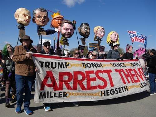 米国全土で大規模な抗議デモが実施されました。トランプ政権の移民政策や海外軍事行動などに反対を表明するデモで、ワシントンDCでは約5000人がアーリントン国立墓地からリンカーン記念堂まで行進し、ニューヨークのタイムズスクエア周辺では数千人が参加しました。一部では「憲法を軽視するな」と訴えるプラカードや、王冠をかぶったトランプ氏を模した造形物が掲げられました。参加者は、移民・関税執行局(ICE)の不法移民取り締まりやイラン攻撃を批判し、現政権の優先順位を強く疑問視しています。