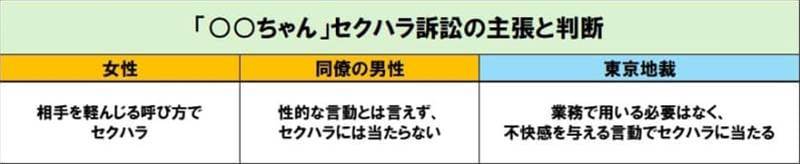 これに加えて、職場での「かわいい」「体形良いよね」といった発言や行為がセクハラとして認められ、女性の訴えが認められました。裁判所はちゃん付け呼びをセクハラと認定し、慰謝料20万円を支払う判決を下しました。