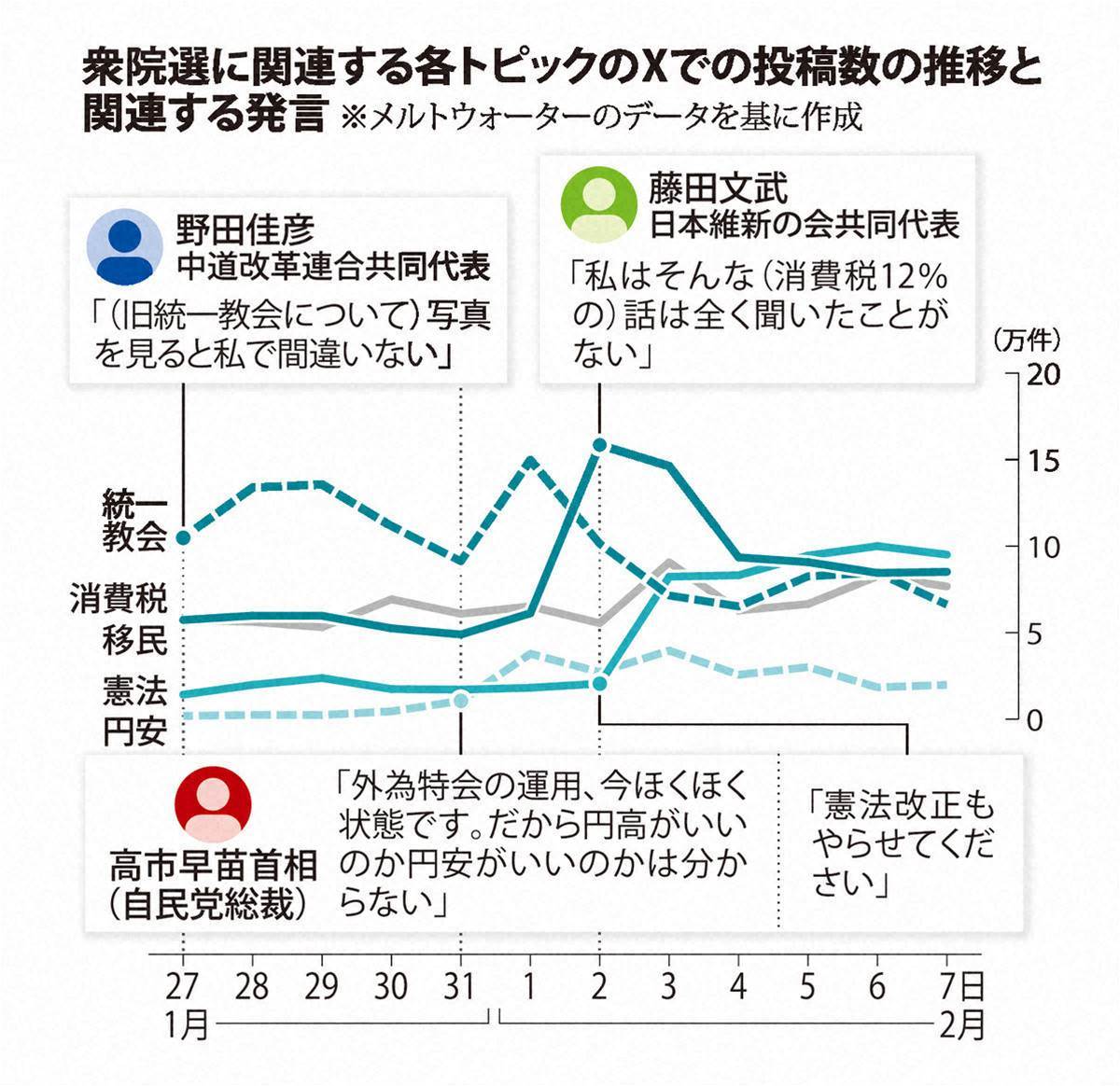 2023年1月27日から2月7日まで行われた衆院選では、SNSプラットフォーム「X」(旧ツイッター)で選挙関連投稿が活発だった。特に「消費税増税」に関する新人候補の発言や切り抜き動画の拡散により大幅増加が見られた。投稿数は参院選と比較して総数で劣るものの、1日平均では約35%増の195万件となった。また、「移民」「統一教会」「憲法」などのトピックが議論を活性化させた一方で、「夫婦別姓」「副首都」などへの関心は低調だった。選挙の重要な争点となる政策がSNSを通じて注目を浴びる一方で、政治家の発言や行動が直ちに拡散され批判対象となる場面も見受けられた。