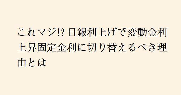 1、5年前、まだ世間のほとんどの人が変動金利なんて上がるわけがないと言っていた頃、相談したフィナンシャルプランナーの方が「固定、変動どちらで借りても良いですが、変動で借りるなら、あらかじめ2%くらいまで金利が上がることを想定した資金計画を立ててください。今のままの金利が続くと信じて借りるのはただのギャンブルです」とおっしゃっていました。今思うと時流に流されない真摯なプランナーの方だったと思います