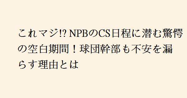 セ・リーグとパ・リーグの公式戦は10月4日および6日に終了したが、CS初戦は同11日からであり、試合のない期間が選手の調整やファンの関心に悪影響を与えている。この問題の解決が求められている。