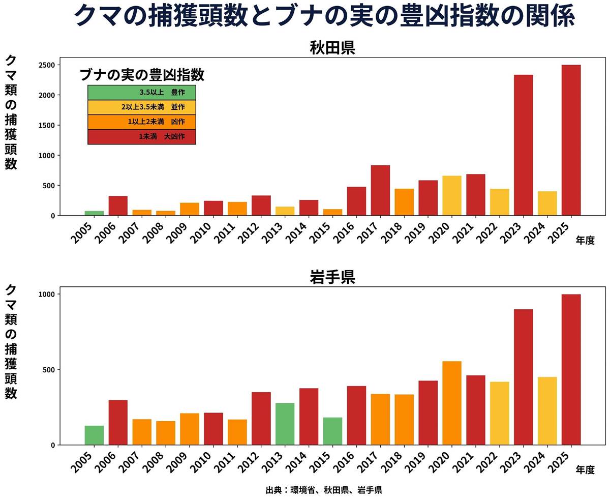 今年は多くの地域でクマの出没が相次ぎ、捕獲頭数も過去最多となった。特に秋田県と岩手県で被害が著しく、230人が被害を受け、13人が死亡している。出没場所は市街地にまで及び、民家や商業施設などで目撃されている。主な原因はブナやミズナラの木の実の凶作による餌不足とクマの生息パターンの変化だ。地球温暖化がこれらの変化に影響している可能性もある。