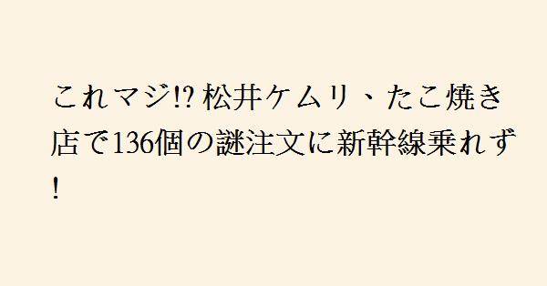 2023年10月23日、日本テレビ系「超特大さんま御殿SP」に出演したお笑いコンビ「令和ロマン」の松井ケムリ(32)は、たこ焼き店での驚きの経験を振り返りました。新大阪から東京へ新幹線で戻る際、30分の余裕を見込んでたこ焼きを購入しようと考えましたが、2人しか並んでいないことから早く買えると思い込んでいました。しかし、一番前の客が8個入りを17セット、合計136個を注文し、既に出来ていたたこ焼きを全て持っていってしまいました。
