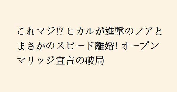2023年10月19日、ユーチューバーのヒカル(34)が自身のYouTubeチャンネルで実業家・進撃のノア(30)との離婚を公表しました。2人は今年5月に「0日婚」として話題になったものの、わずか6カ月後にはスピード離婚に至りました。動画内でヒカルは、自らの行動が原因であること、自分勝手に生きた結果として弁解の余地がないことを説明。