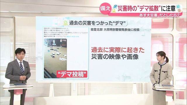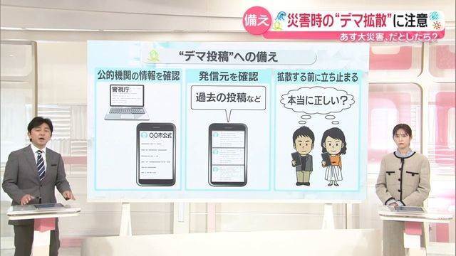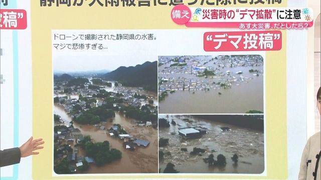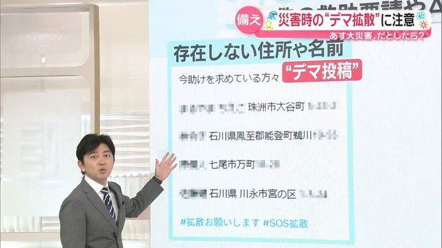2、少し前にテレビで見た災害におけるデマ対策としては、被災地域の人が周辺の状況をネットにアップする際には、その場所であることがわかる看板や建物が映るよう、撮影時に心がけるという方法があったように思います。最近のデマには過去の災害の画像や映像を流用して、どこで撮影したと地名の説明を付けるパターンがありますから、そうしたものの防止にはなると思います。