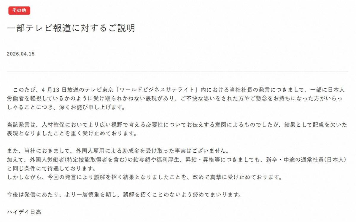事件概要:4月13日、中華チェーン「日高屋」を展開する株式会社ハイデイ日高の青野敬成社長がテレビ東京「ワールドビジネスサテライト」に出演し、特定技能制度に関連した外国人労働者の受け入れ停止について言及。「外国人労働者が頼れなくなるなら、今後は日本人新卒者を中心に採用するしかない」と発言したが、一部で「日本人労働者を軽視している」との受け止めが広がる結果に。同社は公式サイトを通じ、誤解を招く発言だったことを謝罪し、今後のより慎重な発信を約束した。政府の受け入れ停止措置は外食業界に影響を与えつつある背景がある。