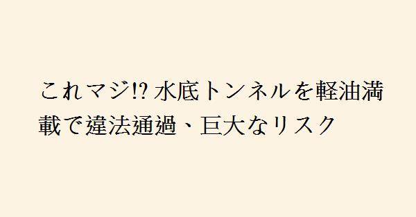 共に通常の爆発よ呼べるものではなく、天津港の爆発は核兵器と見間違うような大きな爆発で日本の観測衛星からも爆発がはっきりと確認できるほど巨大な爆発が起こりました。今回の場合軽油だから爆発規模はそれら化学物質などには及ばないとしても火災でトンネルが崩壊、水没した場合トンネル内の車のほとんどは水没し多くの人命が失われることになるでしょう。今回のような事態がはっきりした以上しばらく通行車両の調査を徹底して、いきなり業績が悪化した会社を内部調査するべきです。同じ業務を行いながらいきなり業績が悪化するということは不正通行で利益を得ていた可能性が非常に高いのですから。