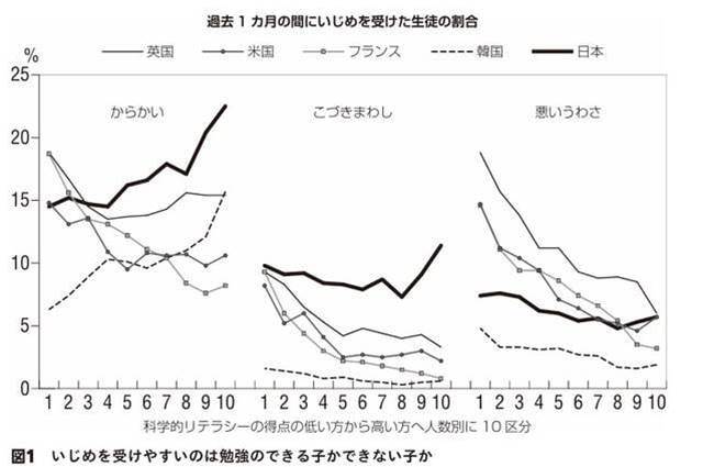 持たざる人のほうが、他人を気に入らないと思うのかも。優秀な人はいじめをしない傾向、そうでない人がいじめをする傾向があって、そういう結果なのでは?それと、弱者をいじめるのは良いことではないという意識が、日本的なのかも。いずれにしても、いじめって嫌な現象。大人の世界でも。気づく側なくす側の人になりたい。