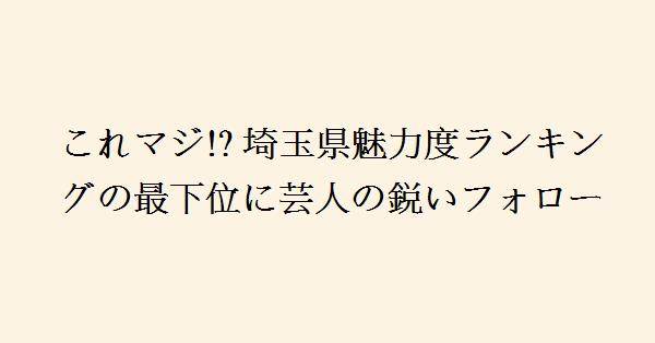 埼玉県が都道府県魅力度ランキングで初めて最下位になったことが23日に放送された日本テレビ系「DayDay.」で特集された。お笑いコンビ、サバンナの高橋茂雄は「最下位やから取り上げられる。30位とかよりいい」とコメントし、積極的にフォロー。また、金メダリストの登坂絵莉は「都内へのアクセスも良く、自衛隊が朝霞市にあり、いいところ」と評価した。MCの山里亮太は千葉県に関し「18位は嬉しくない」と発言。高橋は「埼玉はいじられキャラで飛躍が見込める」と再度フォローし、浦和のうなぎも紹介された。