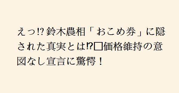 2023年10月9日、鈴木憲和農相は閣議後の記者会見で、物価高対策として政府が自治体に「おこめ券」の活用を促している件について弁解した。彼は一部からの「米価を維持する狙いがある」という指摘に反論し、「消費者が自由に購入できるようにするためのものであり、米価への影響は一切ない」と述べた。価格が高騰する場合、通常は購入者減少が価格下落を引き起こすが、一部自治体は「おこめ券」を活用した消費者支援策が市場機能を歪めるとの批判がある。