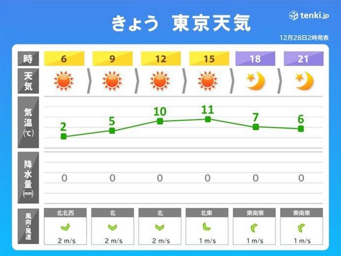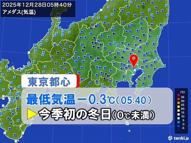 東京都心で本日12月28日(日)午前5時30分、今季初の冬日が観測されました。都心の気温は氷点下0.1℃を記録し、12月に冬日を迎えたのは2022年の12月24日以来3年ぶりです。この寒さは上空の寒気によって全国的に強まり、各地でも冷え込みが顕著です。日中は高気圧が広がり穏やかな晴天が見込まれ、最高気温は昨日より5℃ほど上がり、2日ぶりに10℃を超える見込みです。