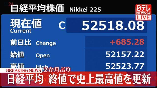 事件概要:2023年6日、東京株式市場で日経平均株価の終値が52518円8銭となり、昨年10月31日以来、約2か月ぶりに史上最高値を更新しました。前日のニューヨーク株式市場ではNYダウが史上最高値を記録し、日本市場への買い注文と連動しました。また、日本経済やAI・半導体関連株への期待感が上昇を後押しした模様です。当初、アメリカによるベネズエラ攻撃の影響で市場下落が懸念されましたが、これを上回る投資家心理が見られました。