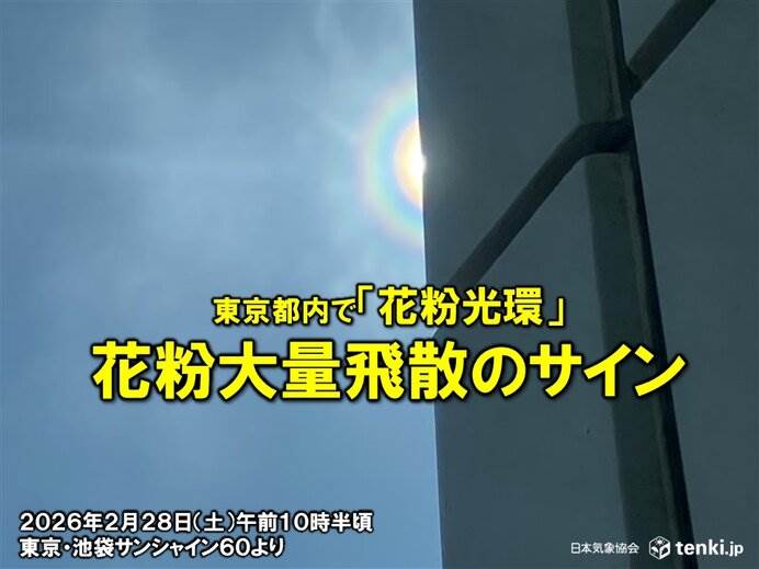 東京都心では、スギ花粉の飛散がピークを迎え、特に気象条件が揃った2月28日には大量飛散が予測されています。同日には、1平方センチメートルあたり100個以上の花粉が飛散し、東京都内で「花粉光環」が観測されました。2月13日には花粉の飛散が始まり、ピークは3月上旬から中旬にかけて続くと予想されています。3月1日には関東から九州にかけて「極めて多い」飛散が予測され、ピークの期間は10日から1か月程続きます。花粉対策として、玄関先で服や髪についた花粉を落とし、窓を閉めたり、部屋干しをすることが推奨されます。