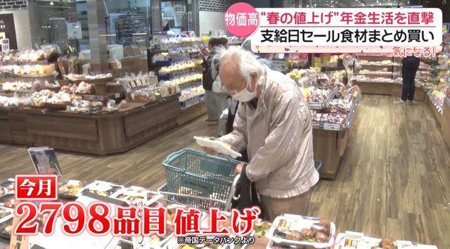 物価高で生活を圧迫される年金受給者の実態が取材されました。2023年4月15日の年金支給日、東京・新宿区のスーパーで高齢者向けセールが開催され、多くの年金生活者が節約のため訪れました。ひと月の年金が6~15万円の受給者を中心に、家賃や食費、生活費の負担に苦しむ声が相次いでいます。中には家賃が毎月の年金額を超えるケースもあり、貯金の取り崩しやアルバイトで賄う実情が浮き彫りに。4月の食品値上げは2798品目にも上り、都内賃貸世帯の年金生活者の厳しさが増している現状です。