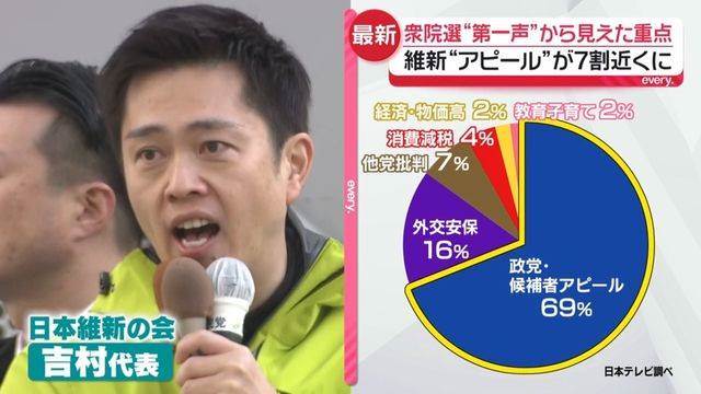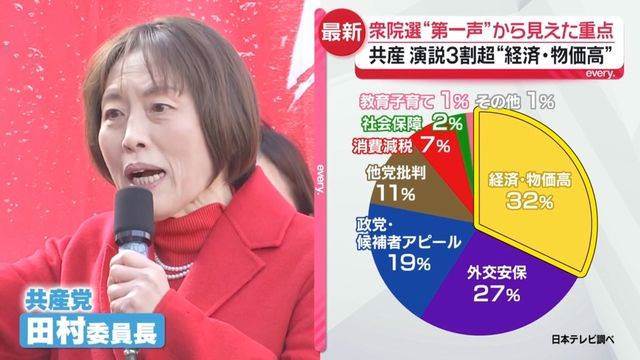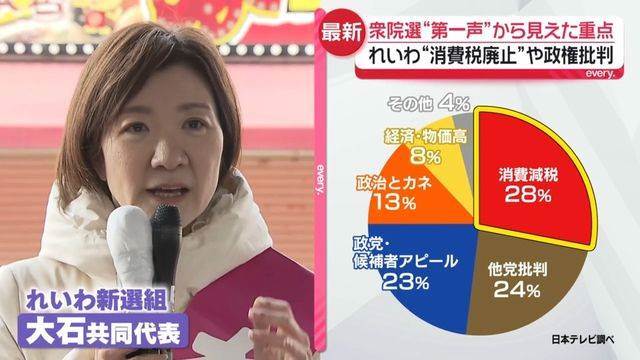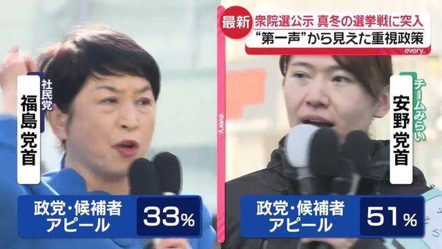 衆議院選挙が27日に公示され、12日間の選挙戦がスタートしました。各党の党首がそれぞれ演説を行い、主要政策をアピール。自民党の高市総裁は「経済・物価高」を最優先事項とし約46%の演説を費やしました。一方で、中道改革連合やれいわ新選組などの野党は政府への批判を交えながら「消費減税」や「政治とカネ」に着目。また、日本維新の会は高市総裁を支持する立場から「候補者アピール」に注力しました。さらに共産党や参政党も富裕層課税や外国人政策など各自の重点政策を強調し、選挙戦は多様な論点が提示されています。投開票日は来月8日です。