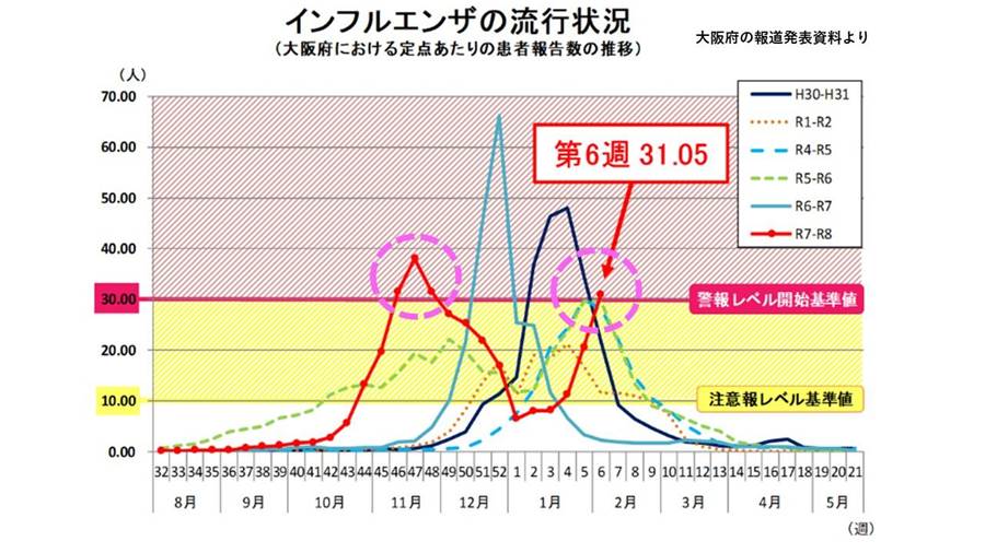 大阪府で、インフルエンザが流行する異例の事態が発生しています。1999年に感染症発生動向調査が開始されて以来、初めて1シーズンで警報基準を2回超えました。2月2日~8日の定点あたり患者報告数は「31.05」で、警報基準「30」を上回る結果となりました。特にB型インフルエンザが増加しており、北河内39.34、南河内39.17など地域別でも数値が上昇しています。昨年11月にはA型が流行しましたが、現在はB型が中心です。大阪府は感染予防の徹底を呼びかけていますが、麻疹の確認も報じられ、さらなる注意が必要とされています。