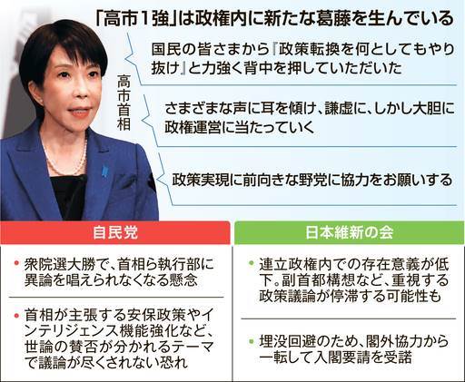 自民党が衆院選で316議席を獲得し、単独で3分の2を超える圧勝を果たした結果、日本維新の会は連立パートナーとしての影響力が低下し、閣外協力から閣内協力へ方針を転換することを決定しました。維新は「アクセル役」としての訴えが響かず、公示前から2議席増の36議席に留まりました。与党内では高市早苗首相の保守的な政策への異論が多数存在し、不満が膨らんでいます。維新の吉村洋文代表は内閣改造に合わせて閣内協力を要請され、応じる意向を示しました。自民党内では反対派が増加しているものの、首相への公然とした異論は抑制される傾向があり、党内の統制が強化されています。