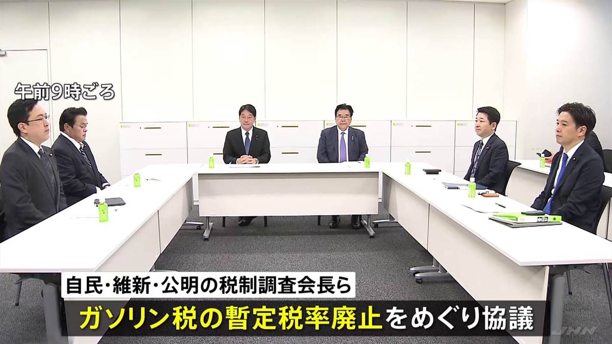 ガソリン税暫定税率の廃止に向けて、与党である自民党、日本維新の会、公明党の税制調査会長らが協議を行い、廃止の時期を現場の負担を考慮して決定する方針を確認しました。一部代替財源として法人税の租税特別措置の見直しが検討されていますが、具体的な合意には至らず、引き続き議論を進める予定です。また、ガソリンスタンドなど事業者に混乱を与えない対応が求められ、業界団体へのヒアリングが行われます。