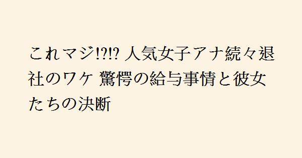 1、東京キー局に採用される女子アナってアナウンサーを目指す全ての人の競争を勝ち抜いた人ばかりだからこれからのテレビ局の未来を予想して時の自分の立場を考えたらテレビ局を退社する選択は当然の事だと思いますよ!逆に退社してフリーになる事で地上波の他局で仕事したり、テレビ局から制限されてたYouTube等のSNSメディアでの仕事出来るとなると良い事の方が多いかもしれませんね!