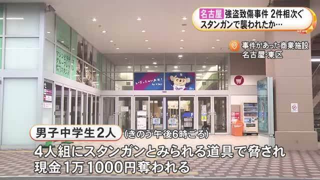 名古屋市東区で5日夕方、中学生と高校生が相次いでスタンガンを使用したとみられる4人組に襲われ、現金が奪われる事件が発生しました。最初の被害は午後6時ごろ、矢田南4丁目の商業施設で発生。男子中学生2人がスタンガンらしき道具を腕に押し付けられ、1万1000円を奪われるとともに軽傷を負いました。その20分後、700mほど離れた東大曽根町の駐輪場で高校生4人が同様に襲われ、2万8000円が奪われました。このうち男子高校生(17)が手に軽いケガを負いました。容疑者は10代の男4人と推測されており、警察が連続強盗致傷事件として捜査しています。