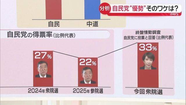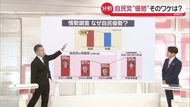 1、ここ最近、メディアの選挙予想は大きく外れることが多くなっています。ネットでは、こうした自民党大勝の予想が、アンダードッグ効果を生み、逆に自民党が議席を減らすのではないか、メディアがそれを画策しているのではないか、というのが専らの噂です。また、悪天候による投票率の低下から、中道改革連合など、組織票を持つ候補が有利になるとの見方もあります。