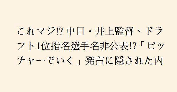 中日の井上一樹監督が10月22日、東京都内のホテルでスカウト会議後に取材に応じ、翌23日のドラフト会議での1位指名選手は「ピッチャーでいく」と明言しました。選手名については公表を避け、熟慮中であることを示しました。投手選びにおいて、年齢や成長可能性、即戦力としての活用をどう見るかで悩んでいると語りました。また、巨人が鷺宮製作所の竹丸和幸投手の1位指名を公表したことに触れ、他球団の動向も注視しながら最終決定を下す考えです。