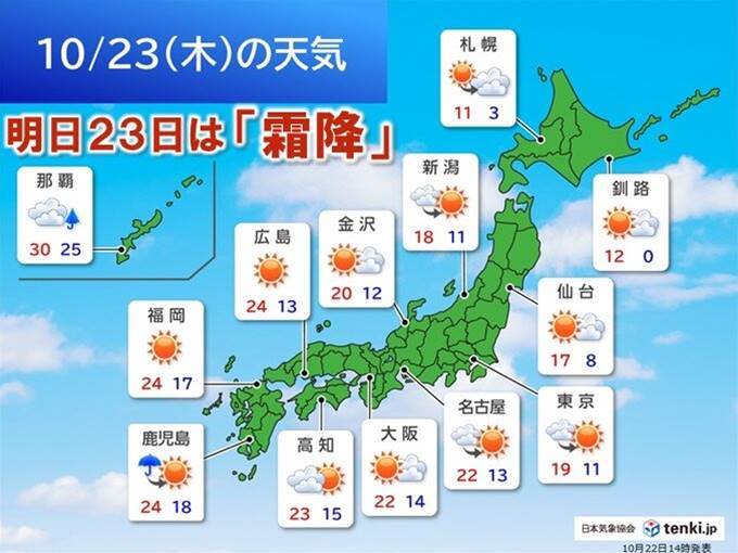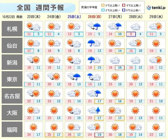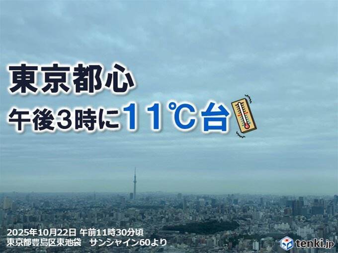 東北から九州にかけて広い地域で10月22日(水)、曇りや雨が続き、全国的に平年を下回る気温が観測されました。特に太平洋側では初冬の寒さとなり、東京都心では午後3時の気温が11.5℃、仙台市では13.4℃、大阪市では14.0℃、松山市では15.1℃と冬を感じさせる寒さでした。翌日23日(木)には太平洋側の雨が止み、天気は回復、日中の気温は上昇する見込みですが、朝は冷え込みが続きます。