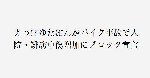 ユーチューバーで「冒険家」を名乗るゆたぼん氏(16)は、6日の朝にバイクで帰宅中、対向車線の車に衝突される人身事故に遭いました。彼は法定速度を守って走行していたにもかかわらず、突然センターラインを超えた車と衝突し、体中に包帯を巻いた姿で入院中です。9日にはX(旧ツイッター)で、入院後に誹謗中傷コメントが増えたことを明かし、「心も体もボロボロで相手にする気もないので、容赦なくブロックします」と述べました。