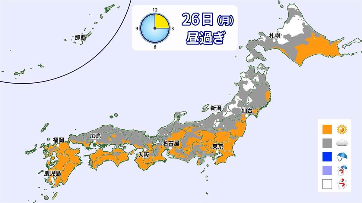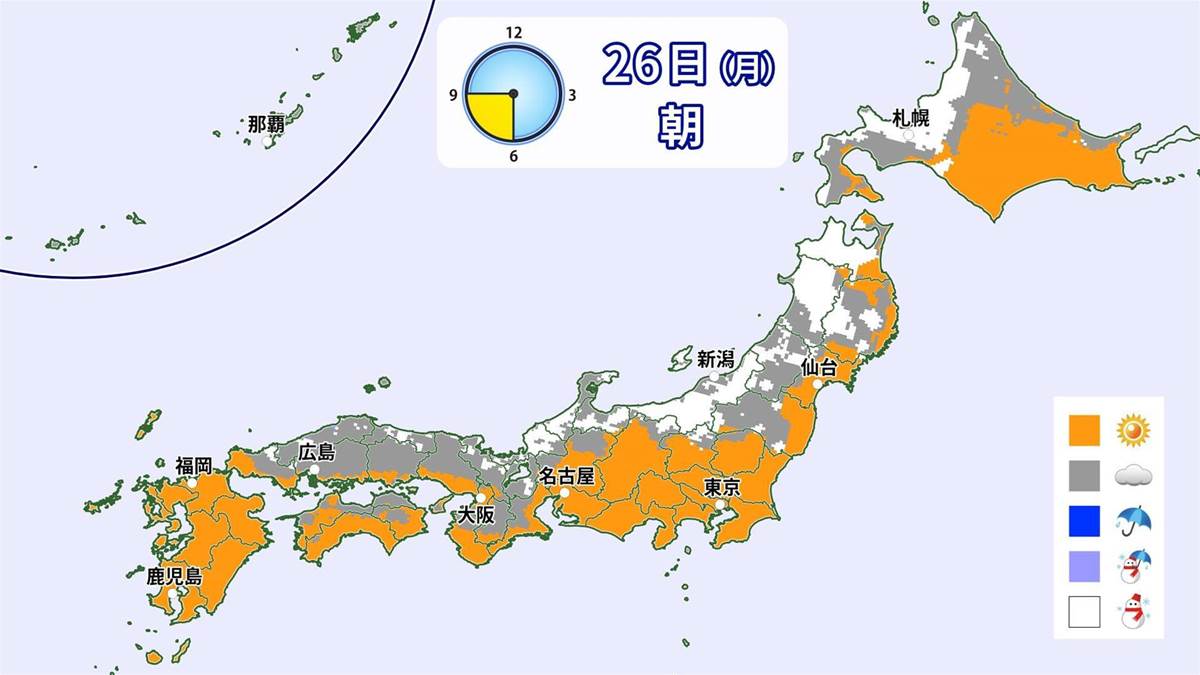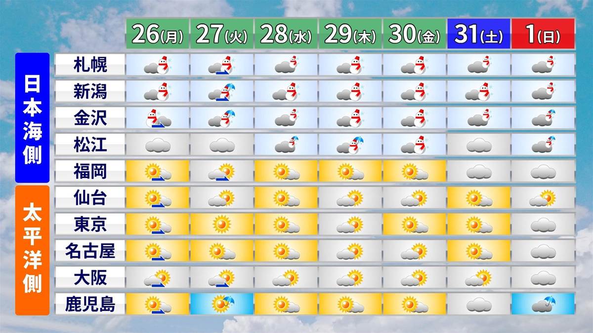 長期間続いた寒波が緩み、日本海側の大雪が収束に向かっている中、積雪量が依然として多い地域が残っています。26日(月)は、寒波が弱まりつつあるため昼以降は降雪の範囲が縮小し、大雪も収まる見込みです。しかし、北海道や青森では依然として積雪が増える可能性があり、なだれや落雪、除雪作業中の事故など依然として危険が存在します。除雪作業は必ず複数人で行うよう推奨されています。最高気温は日本全国で10℃以下と寒さが続き、日本海側では28日以降再び広範囲で雪が予測されているため、雪への備えが引き続き重要とされています。