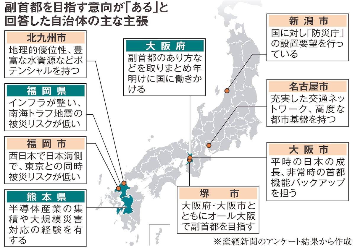 災害時の首都機能の代替を目指す「副首都」構想に関するアンケート調査で、全35自治体のうち9自治体(新潟市、名古屋市、大阪市、堺市、北九州市、福岡市、大阪府、福岡県、熊本県)が副首都を目指す意向を示しました。この中で特別区設置を要件とすることに「賛成」と答えたのは日本維新の会系首長がいる堺市と大阪府のみでした。自民党と維新が令和8年の通常国会で副首都に関する関連法案提出を協議中で、定義や要件次第で目指す自治体が増える可能性があります。