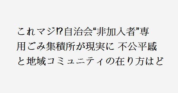 2、自治会に入らなくてもいいが集積所の掃除当番と負担金は出してもらいたい自治体にもよるけど集積所開設には管理者が必要で個人では認められないので自治会等の団体が管理者になっている、集積所を設置している土地も市の所有、自治会の所有、個人所有で変わってくる集積所に猫やカラスが入らないように囲いやネットを設置するのも費用がかかり管理者の自治会等が負担している管理費用も自治会が出しているので非加入者が何も負担なしに使うのには問題がある自治体等が条例等で非加入者も集積所のゴミ当番と負担金支払いなどを義務付ければ問題は解決する裁判になっても負担金支払いなど判決が出ている