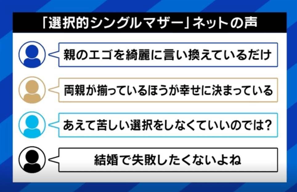 コメント:この問題を深く掘り下げれば、制度的な歪みが大きく影響していることに気づかされます。現在、日本では選択的シングルマザーが適切な支援を受けられる環境が整備されているとは言いがたい。