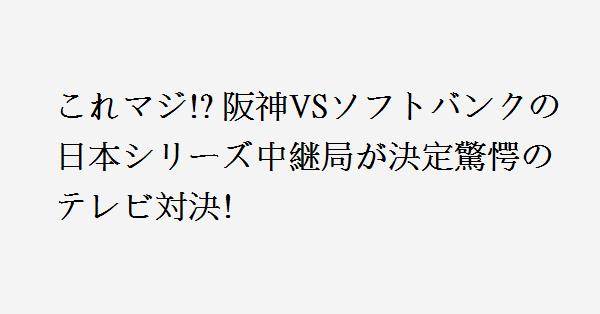 1、阪神主催の場合は在阪局のアナウンサーで中継すると思うけど、ソフトバンク主催の場合は福岡の放送局になるのか?それとも東京から乗り込むのか?個人的には福岡の放送局のアナウンサーに実況して欲しいけど。