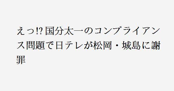 2、こういう時に役立つのは日本の根回し、って文化だと思うんですよねそもそもが大きな問題だったのに国分さん1人をどうにかすれば解決出来ると考えたのが日本テレビの驕りだと普通はまず番組責任者と日テレの社長なり偉い人が、リーダーと松岡さんを呼んで、実は国分さんについてこういう話が出ている。