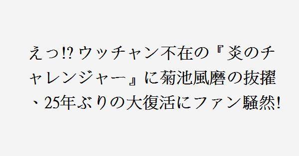 4、「なぜウッチャンは出演しないのか?」という質問に対するテレ朝からの「25年ぶりの放送ということで、令和に復活する新たな「炎のチャレンジャー」をお届けできればと思い、「炎チャレ」と“同い年” (※95年生まれ)の菊池風磨さんを新MCとしてお迎えすることと致しました」という回答は質問の意図をはぐらかしているして良く意味がわからないし、苦しい言い訳のようですね。菊池さんはMCが上手いのでナンチャンとのダブルMCで番組構成上は全く問題ないとは思いますが、「ウッチャンナンチャン」と冠が付いている番組にもかかわらずウッチャンが出演しないのはとても残念だし、色々と勘ぐってしまいます。