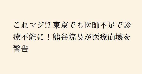 東京23区内でさえ医師不足が深刻化し、特定の診療科が医療不能に陥る事態が発生した。2024年春、都内の病院で透析や腎臓関連手術が受けられなくなったケースも確認されており、患者は転院を余儀なくされた。この状況は今後さらに悪化が予想されており、国の人手不足対策として65歳以上の高齢者を労働力とする案が浮上しているが、問題の解消には至っていない。