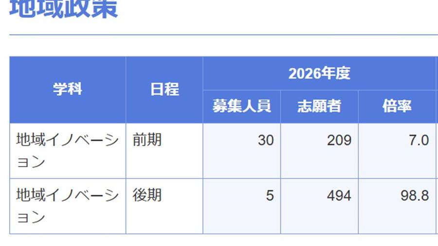福井県立大学地域政策学部地域イノベーション学科の新設に伴い、2026年度後期日程では志願倍率が全国最高の98.8倍となった。募集人員5人に対し494人が志願したためである。同学部は地域イノベーション創出に必要な知識を体系的に学ぶ内容が特徴で、実務的な教育として国内留学や企業・官公庁への出向実習が含まれている。これまでに地域系学部を持つ大学は複数あるが、福井県立大学の独自性や今年の学部新設が注目を集めた要因と考えられる。後期募集の少人数枠は高倍率になりやすい一方、地域学部や化粧品学部など専門的で新しい分野への関心が学部人気に表れている。
