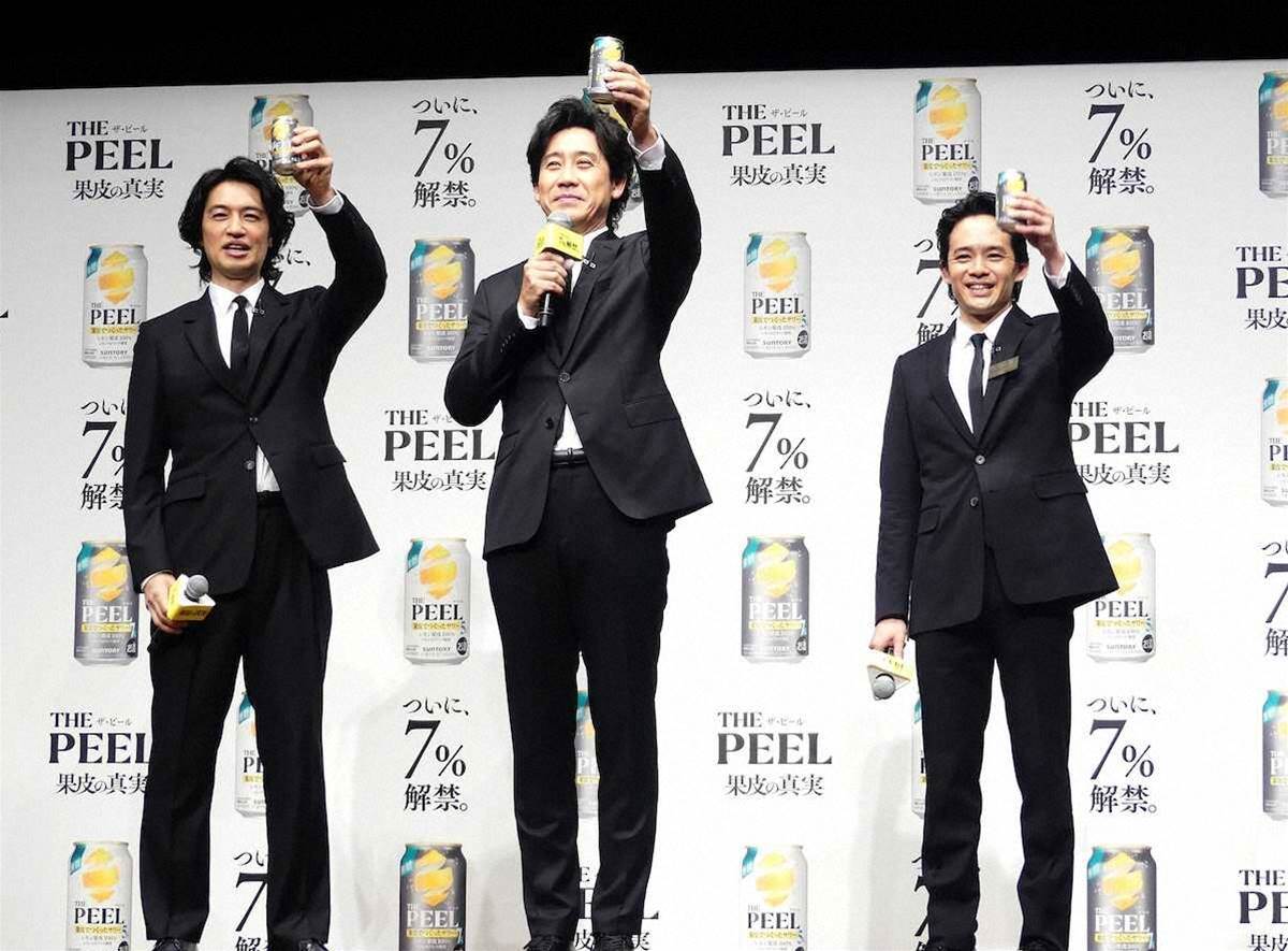 俳優の大泉洋(52)、斎藤工(44)、池松壮亮(35)が、16日に都内で行われたサントリー「THE PEEL」の新CM発表会に出席しました。イベントでは、昨年不参加だった池松が「戦力になるように頑張ります」と意気込むと、大泉が「頼むよ、よく休めたもんだ」と冗談交じりにコメント。3人はレモンの皮むき対決に挑戦し、「途中で皮が途切れるとCM契約終了」というルールで盛り上がりました。池松が途中で失敗すると、大泉がユーモアたっぷりに「契約終了!」と叫び会場を沸かせます。その後、イベントでは池松が最も高評価を得て「果皮マイスター」の認定バッジを授与されました。大泉は「大河の撮影につけていけ!」とさらに会場を笑いで包み、終始和やかな雰囲気が続きました。