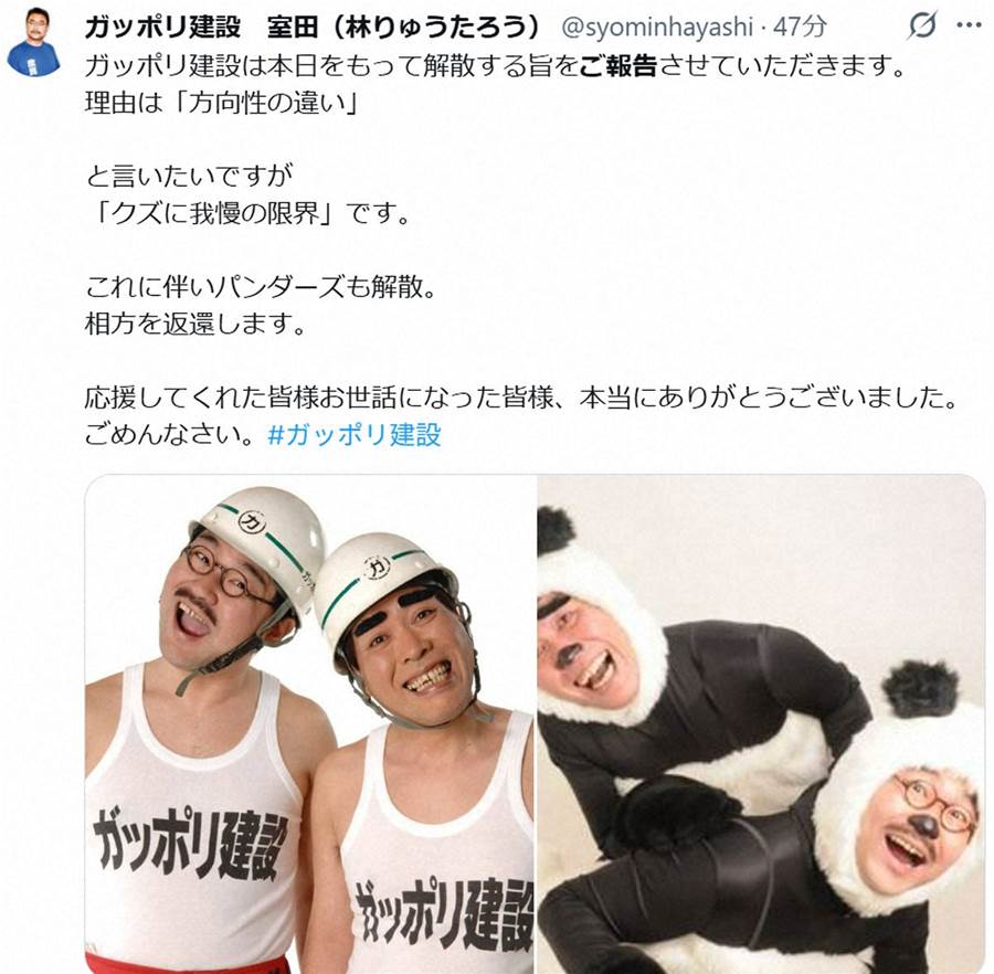 お笑いコンビ「ガッポリ建設」が解散を発表しました。31日に室田稔(54)が自身のXアカウントで、このニュースを報告しました。室田によると、解散の理由は「方向性の違い」とするのが普通ですが、実際には「クズに我慢の限界」であったと述べています。また、この解散に伴い「パンダーズ」という別のグループも解散するとし、「相方を返還」とユーモラスに表現しつつ、応援してくれたファンや関係者への感謝の意を示し、謝罪しています。